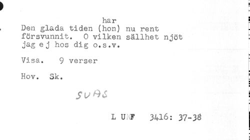 //// har ! //// Den glada tiden (hon) nu rent //// försvunnit. 0 vilken sällhet njöt E //// jag e j hos dig o.s.v. //// i //// Visa. 9 verser //// Hov. Sk. : //// g //// g //// ! //// L U-J 3416: 37-33 //// H ////