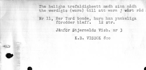 //// The heligha trefaldigheett medh sinn nådh //// the werdigis (wara) till att wara j wårt råd //// Nr 11, Her Tord bonde, huru han ynckeliga //// förodder bleff. 12 str. //// Jämför Stjernelds Visb. nr 3 //// K.B. VISBOK 3:o //// ^ . . - //// ** ////