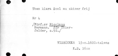 //// Then klara Sool nu skiner frij //// Nr 4 //// /Förf.av Nicolaus //// Hermann. Jfr Thier- //// felder, s.92. //// /H;! ' //// VISBÖCKER l$-o.1600-talens //// K.B. l6:o //// t-* ////