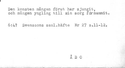 //// Den konsten mången förut har sjungit, //// och mången yngling till sin sorg förnummit. //// 6:4? Svenssons saml.häfte Nr 2? s.11-12. //// ÅBO //// * //// ___ - _____ ___ -___——..___ . ____-.____ _____—___-___... ____ _____. .. .. . ////