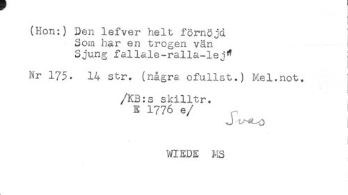 //// (Hon:) Den lefver helt förnöjd //// Som har en trogen vän //// Sjung fallale-ralla-lej* //// Nr 175. 14 str. (några ofullst.) Mel.not. //// /KB:s skilltr. //// E 1776 e //// /J t^O //// WIEDE MS //// t ////