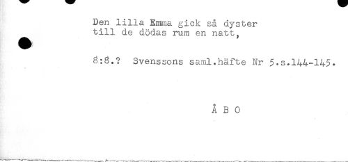 //// Den lilla Emma gick så dyster //// till de dödas rum en natt, //// 8:8.? Svenssons saml.häfte Nr 5.s.144-145. //// t //// ÅBO ////