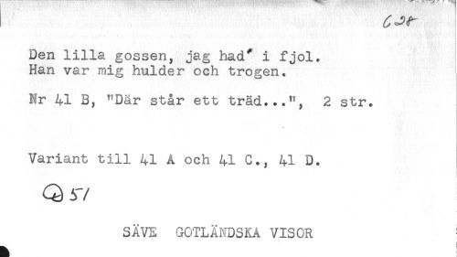 //// Den lilla gossen, jag had' i fjol. //// Han var mig hulder och trogen. //// Nr 41 B, "Där står ett träd...", 2 str. //// Variant till 41 A och 41 C., 41 D. //// Qy //// /SAVE GOTLÄNDSKA VISOR ////