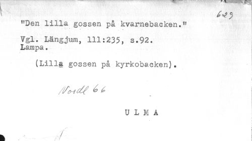 //// "Den lilla gossen på kvarnebacken." //// Vgl. Längjum, 111:235, s.92. //// Lampa. //// //// /(Lillg gossen på kyrkobacken). //// * //// ! ////