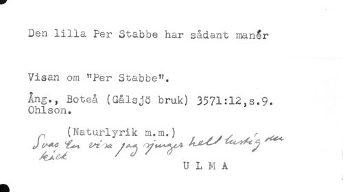 //// Den lilla Per Stabbe har sådant manår //// Visan om "Per Stabbe". //// Ång., Boteå (Gålsjö bruk) 3571:12,s.9. //// Ohlson. //// ^ (Naturlyrik m.m.) ^^ ////