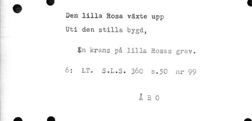 //// Den lilla Rosa växte upp //// Uti den stilla bygd, //// ^n krans på lilla Rosas grav. //// 6: LT. S.L.S. 360 s.50 nr 99 //// ! ' ////