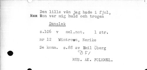 //// Den lilla vän jag hade i fjol, //// MEHK Hon var mig huld och trogen //// Danslek //// s.106 v mel.not. 1 str. //// nr 12 Wintrowa, Nerike //// Se komm. s.^3 av Bnil Öberg //// MUS. AK. FOLKMEL. ////