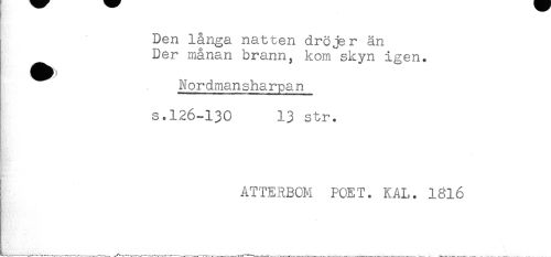 //// Den långa natten dröjer än //// Der månan brann, kom skyn igen. //// Nordmansharpan //// s,126-130 13 str. //// ATTERBOM POET. KAL. Ml 6 ////