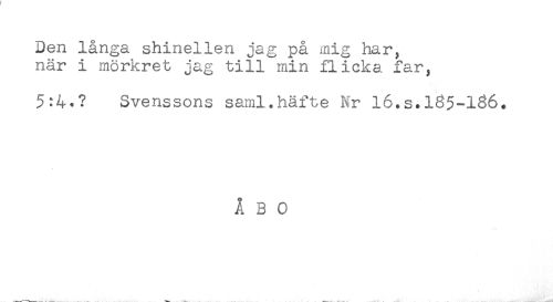 //// Den långa shinellen jag på mig har, //// när i mörkret jag till min flicka far, //// Svenssons saml.häfte Nr 16.s.185-186. //// ÅBO ////
