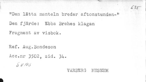 //// "Den lätta manteln breder aftonstunden-" //// Den fjärde: Ebba Brahes klagan //// Fragment av visbok. //// ! //// Ref. Aug.Bondeson //// * - //// Acc.nr 3502, sid. 34. //// VARBERG MUSEUM ////