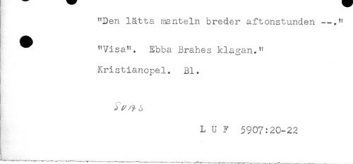 //// "Den lätta manteln breder aftonstunden —." //// ^ "Visa". Ebba Brahes klagan." //// Kristianopel, Bl. //// ! //// ! //// ! //// L U ? 5907:20-22 ////