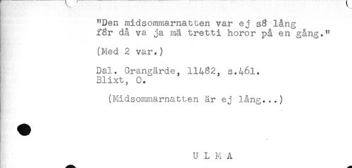 //// ! "Den midsommarnatten var ej s^ lång //// f6r då va ja mä tretti horor på en gång," //// (Med 2 var.) //// R . //// Dal, Grangärde, 114^2, s.46l. //// ! Blixt, 0. //// B' //// Hp-'. //// (Midsommarnatten är ej lång.,.) //// U L M A ////