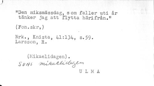 //// "Den miksmässdag, s om faller uti år //// tänker jag att flytta härifrån." //// (Fon.skr,) //// Nrk., Knista, 41:134, s.59. //// Larsson, R. //// (Mikaelidagen). //// U L M A ////