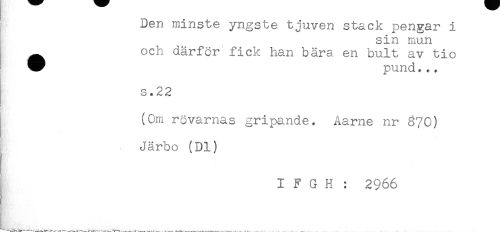 //// Den minste yngste tjuven stack pengar i //// sin mun //// ^ och därför fick han bära en bult av tio //// s.22 //// (Om rövarnas gripande. Aarne nr É70) //// Järbo (Dl) //// I F G H : 2966 ////