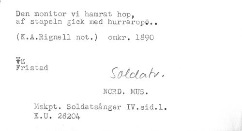 //// Den monitor vi hamrat hop, //// af stapeln gick med hurrarops.. //// (K.A.Rignell not.) omkr. 1890 //// Vg //// Fristad ^ „ //// NORD. MUS. //// Mskpt. Soldatsånger IV.sid.1. //// E.U. 28204 ////