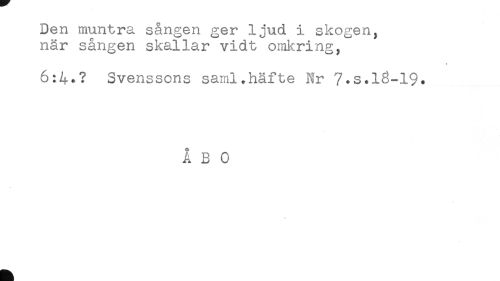 //// Den muntra sången ger ljud i skogen, //// när sången skallar vidt omkring, //// 6:4.? Svenssons saml.häfte Nr 7*s.16-19. //// ÅBO ////