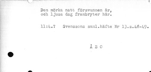 //// Den mörka natt försvunnen är, //// och ljusa dag frambryter här. //// 11:4.? Svenssons saml.häfte Nr 13.s.43-49. //// - //// ÅBO //// * //// - ////