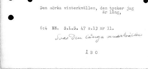 //// Den mörka vinterkvällen, den tycker jag //// ^ är lång, //// . //// 6:4 EE. S.L.S. 47 s.13 nr 11. //// ÅBO //// ^ ___ ____ _ _____ ////