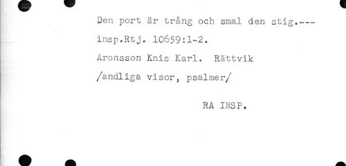 //// Den port är trång och smal den stig.--- //// insp.Rtj. 10659:1-2. //// Aronsson Knis Karl. Rättvik //// /andliga visor, psalmer //// /RA INSP, ////