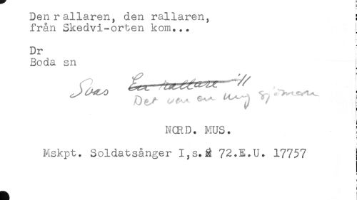 //// Den rallaren, den rallaren, s //// från Skedvi-orten kom... //// f //// i //// f //// Dr //// Boda sn //// r L...' //// Da/* ^^ ^ ^^ ^ //// N(RD. MUS. ! //// i //// Mskpt. Soldatsånger I,s.^ 72.E.U. 17757 ////