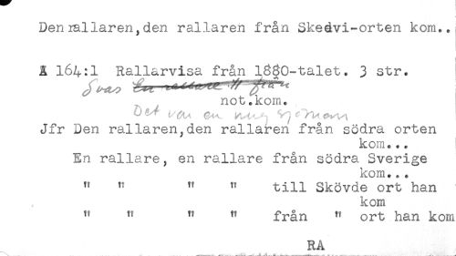 //// Deniallaren,den rallaren från Skeévi-orten kom..j //// i //// A 164:1 Rallarvisa från l8§0-talet. 3 str. //// not.kom. //// Jfr Den rallaren^den rallaren från södra orten //// kom... //// En rallare, en rallare från södra Sverige //// kom... //// " " " " till Skövde ort han //// kom //// ^ " ^ tt n ort han kom //// RA //// . . < — ____— . — ^ . .———_____-__—____ ^ — . . . . .ji ////