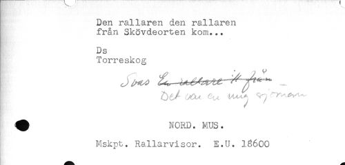 //// Den rallaren den rallaren //// från Skövdeorten kom... //// . //// Ds //// I Torreskog //// ^ NORD. MUS. //// Mskpt. Rallarvisor. E.U. 18600 ////
