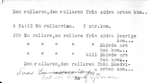 //// Den rallaren,den rallaren från södra orten kom.. //// A 54:12 En rallarviga. 5 str.kom. //// Jfr En rallarenen rallare från södra Sverige //// kom... //// 't " " " " Skövde ort //// han kom..* //// " " " " till Skövde ort //// han kom$*. //// Den rallaren,den rallaren från Skedvi- //// ^ ^ ^ orten kom... ////