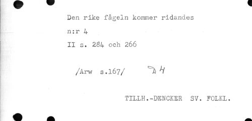 //// Den rike fågeln kommer ridandes //// n:r 4 //// II s. 2g4 och 266 //// /Arw s.16?/ ^ ^ //// TILLH.-DENCKER SV. FOLKL. //// — * ////