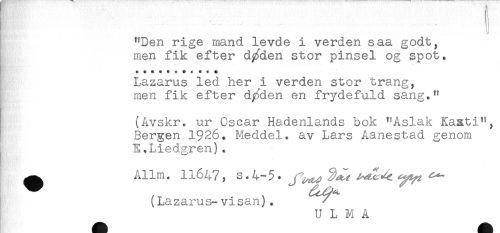 //// - * ' - ' — ' . . ....- * < - -* — * //// ^Den rige mand levde i verden saa godt, //// men fik efter d^den stor pinsel og spot. //// Lazarus led her i verden stor träng, //// men fik efter d^den en frydefuld sang.^ //// (Avskr. ur Oscar Hadenlands bok "Aslak Kaxti^ //// Bergen 1926. Meddel. av Lars Aanestad genom //// E.Liedgren). //// ^ Allm. 11647^ //// * (Lasarus-visan). ^ //// U L M A ////