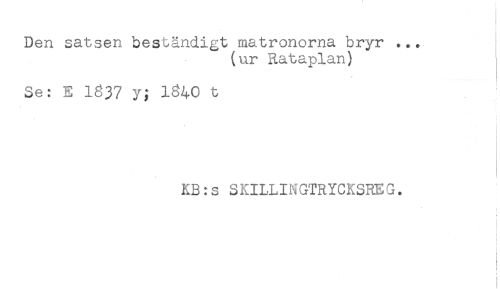 //// Den satsen beständigt matronorna bryr ... //// (ur Rataplan) //// Se: E 1337 y; 1340 t //// - //// KB:s SKILLINGTRYCKSREG. //// t //// t- //// S //// i //// t //// i //// I //// t ////