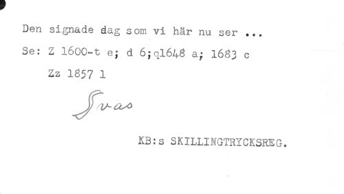//// Den signade dag som vi här nu ser ... //// Se: Z 1600-t e; d 6;ql648 a; 1683 c //// Zz 1857 1 //// KB:s SKILLINGTRYCKSREG. ////