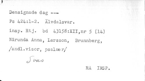 //// Densignade dag —— //// Ps 424:1-2. Alvdalsvar. //// insp. Rtj. bd 43153:XII,nr 5 (14) //// Närunda Anna, Larsson, Brunnberg, //// /andl.visor, psalner //// /! //// RA INSP. ////