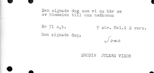 //// Den signade dag som vi nu här se //// av himmelen till oss nedkomma //// Pr' //// ^ 71 a,b. 9 str. Mel.i 2 vers. //// Den signade dag. //// . //// BRODIN JULENS VISOR ////