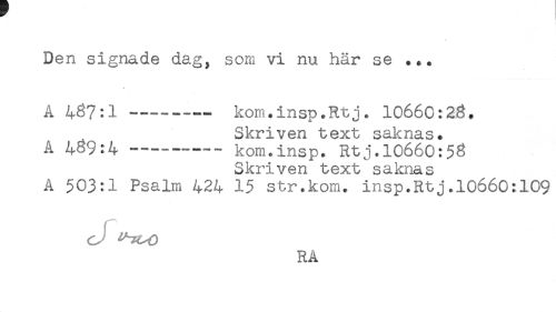 //// Den signade dag, som vi nu här se ... //// A 487:1 --- kom.insp.Rtj. 10660:23. //// Skriven text saknas. //// A 489:4 ---- kom.insp. Rtj.10660:58 //// Skriven text saknas //// A 503:1 Psalm 424 15 str.kom. insp.Rtj.10660:109 //// RA ////