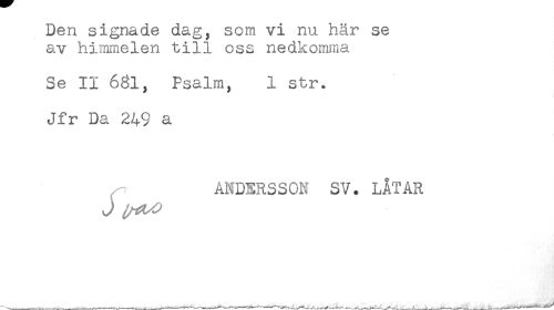 //// Den signade dag, som vi nu här se //// av himmelen till oss nedkomma //// Se II 681, Psalm, 1 str. //// Jfr Da 249 a //// ANDERSSON SV. LÅTAR ////