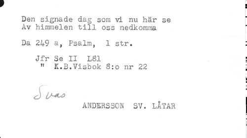 //// Den signade dag som vi nu här se //// Av himmelen till oss nedkomma //// ] //// < //// ! //// Da 249 a, Psalm, 1 str. : //// Jfr Se II L8l ^ //// " K.B.Visbok 8:0 nr 22 j //// H //// H //// ANDERSSON SV. LÅTAR //// F //// & //// E //// r //// < //// ! //// < //// k ////