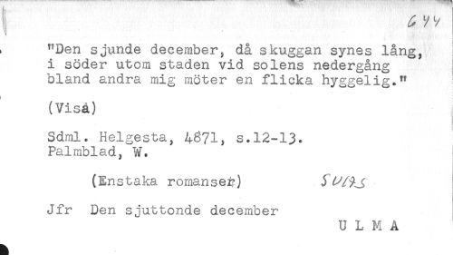 //// ^ ^Den sjunde december, då skuggan synes lång, j //// i söder utom staden vid solens nedergång i //// bland andra mig möter en flicka hyggelig." //// (Viså) j //// Sdml. Helgesta, 4671, s.12-13. //// Palmblad, ¥. //// (Enstaka romanser) y* ^ //// Jfr Den sjuttonde december //// U L M A //// t ////