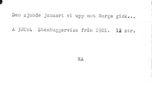 //// t //// ' //// Den sjunde januari vi upp mot Norge gick... ! //// t //// A 320:4 Stenhuggarvisa från 1901. 13 str. //// - //// t //// : //// ; //// '! //// i //// t //// [ //// f //// RA ////