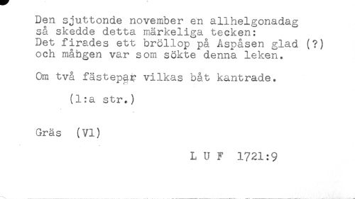 //// Den sjuttonde november en allhelgonadag //// så skedde detta märkeliga tecken: //// Det firades ett bröllop på Åspåsen glad (?) //// och mången var som sökte denna leken. //// Om två fästepar vilkas båt kantrade. //// (l;a str.) //// Gräs (VI) //// L U F 1721:9 ////