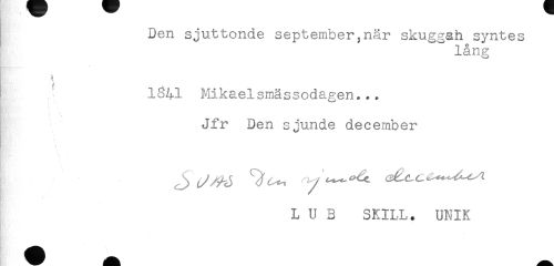 //// Den sjuttonde september,när skuggah syntes //// lång //// M //// - ^ //// 1^41 Mikaelsmässodagen,.. //// Jfr Den sjunde december //// - //// . //// L U B SKILL. UNIK //// - ////