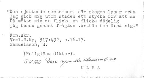 //// "Den sjuttonde september, när skogen lyser grön ! //// jag gick mig utom staden ett stycke för att se [ //// Då mötte mig en flicka en flicka däjelig //// jag henne genast frågade varthän hon äma sig." //// Fon.skr. //// Vrml.N.Ny, 517:432, s.16-17* //// Samuelsson, S. //// (Religiösa dikter). //// ^ U L M A ////