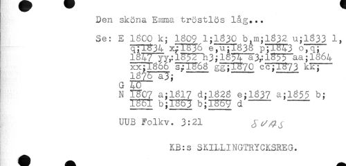 //// Den sköna Emma tröstlös låg... //// Se: E 1SC0 k; 1309 1;1330 b,m;l632 u;l633 1, //// 011^34 x;1536 e,u;i836 plTSlT3 O,q; //// l^TTy y,: 1F51TT13; 1837^3,: 1^53"aa; 1364 //// BFTI866 s71^*68 gglTö70 ccJT373 klT] //// G 40 //// N 1^07 a:l6l7 d:l62g e:l637 a:l6$5 b: //// IBBI b;TS5J d //// UUB Folkv. 3:21 //// KB:s SKILLINGTRYCKSREG. ////