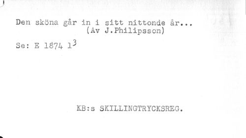 //// Den sköna går in i sitt nittonde år... //// (Av J.Philipsson) //// Se: E 1874 l^ //// KB:s SKILLINGTRYCKSREG. ////
