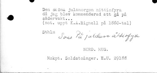 //// Den sköna julamorgon nittiofyra //// ^ då jag blev kommenderad att gå på //// ^^ sädervakt... //// (not. uppt K.A.Rignell på 1880-tal) //// Sthlm ,, ' //// B:' ' //// NORD. MUS. //// Mskpt. Soldatsånger. E.U. 29138 //// L^.___^^_____^_^ ////