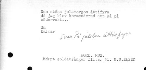 //// i Den sköna julamorgon åttifyra //// då jag blev kommenderad att gå på //// södervakt... //// Sm //// Kalmar ^ < //// /# NORD. MUS. //// Mskpt soldatsånger III.s. 51. E.U.24220 ////