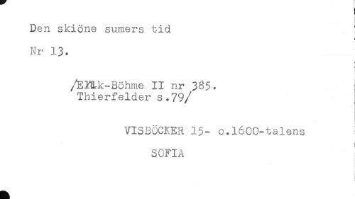 //// ! //// Den skiöne sumers tid //// Nr 13. //// j //// < //// i //// /EKLk-Böhme II nr 3^5. //// Thierfelder s.79 //// /VISBÖCKER 1$- o.l600-talens //// SC-FIA ////