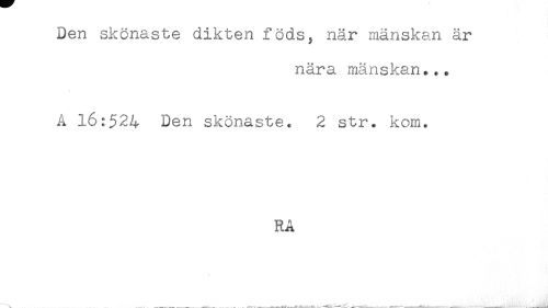 //// Den skönaste dikten föds, når mänskan är //// nära mänskan... //// A 16:524 Den skönaste. 2 str. kom. //// RA //// * //// . ^ * _ ^ ^ ^^_^ -* ut - ___ * -A. ////