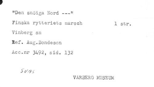 //// "Den snöiga Nord ---" //// Finska rytteriets marsch 1 str. //// Vinberg sn //// Ref. Aug.Bondeson //// Acc.nr 3492, sid. 132 //// VARBERG MUSEUM ////