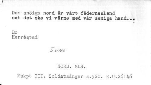 //// Den snöiga nord är vårt fädernesland //// och det ska vi värna med vår seniga hand.** //// a //// Bo //// Herr^stad ) //// ] //// NORD. MUS. //// Mskpt III. Soldatsånger s.520. E.U.26146 ////