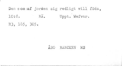 //// Densomsaf joräen sig redligt vill föda, //// 10:8. NÄ. Uppt. Wefvar. //// R3, 165, 305. //// ÅBO RANCKEN MS ////